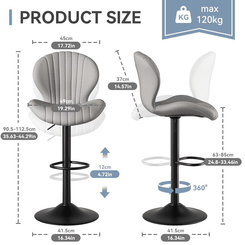 Adjustable & 360° Swivel Function: This bar stool features a gas-lift mechanism for flexible height adjustment, and the 360° swivel function offers full mobility. The rubber ring on the base prevents floor scratches, while the built-in footrest adds extra support and comfort.