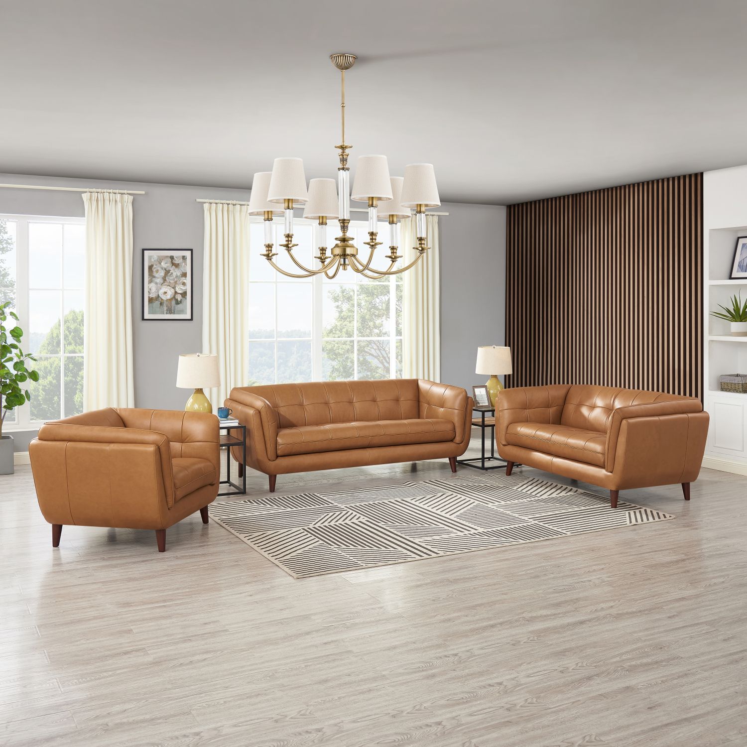 Premium Leather: Top-grain leather is upholstered on the seating areas and armrests. Split-grain leather is used on the sides and back.