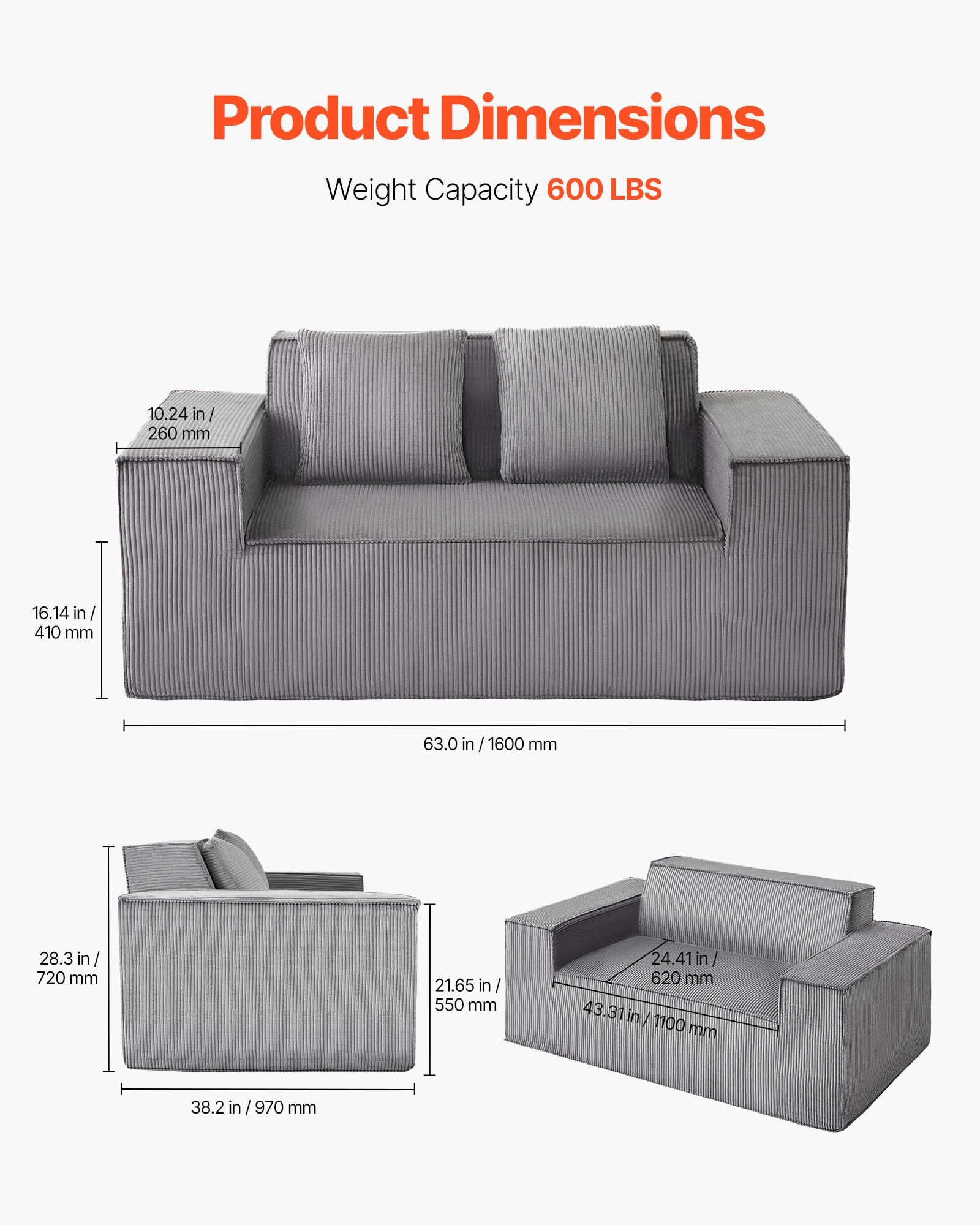 4.Space-Saving Loveseat: Measuring 63" W x 37" D x 28.3" H, this compact loveseat is ideal for studio apartments and small living rooms. The spacious seat ensures comfort even when sharing, and it supports up to 600 lbs