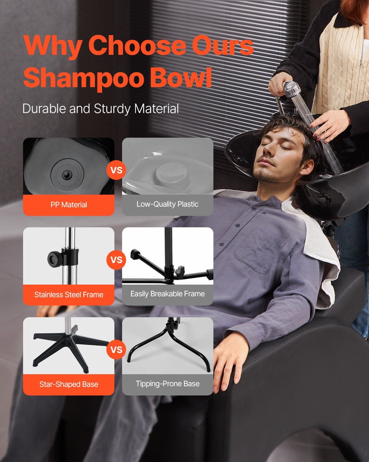 1.Stable Structure: This shampoo sink is made of high-strength PP material, fixed with a stainless steel frame and supported by a star-shaped base, providing strong and stable neck support for an effortless hair care experience.